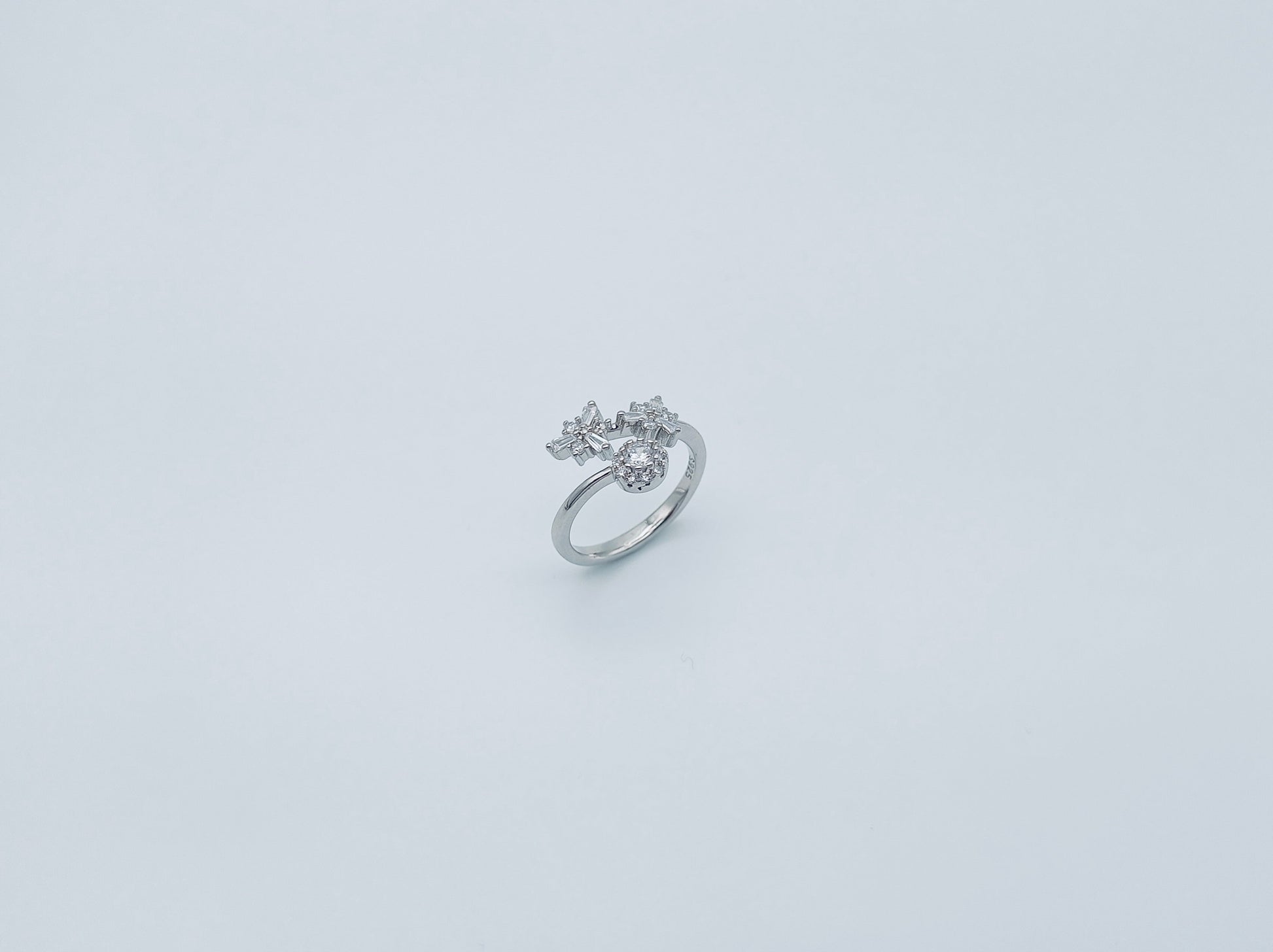 This image shows a silver-colored ring with a contemporary design. The ring features a prominent central round stone, likely a diamond or cubic zirconia, surrounded by smaller stones in a decorative arrangement. The accent stones appear to be set in a floral or starburst pattern, giving the ring a modern and elegant look.