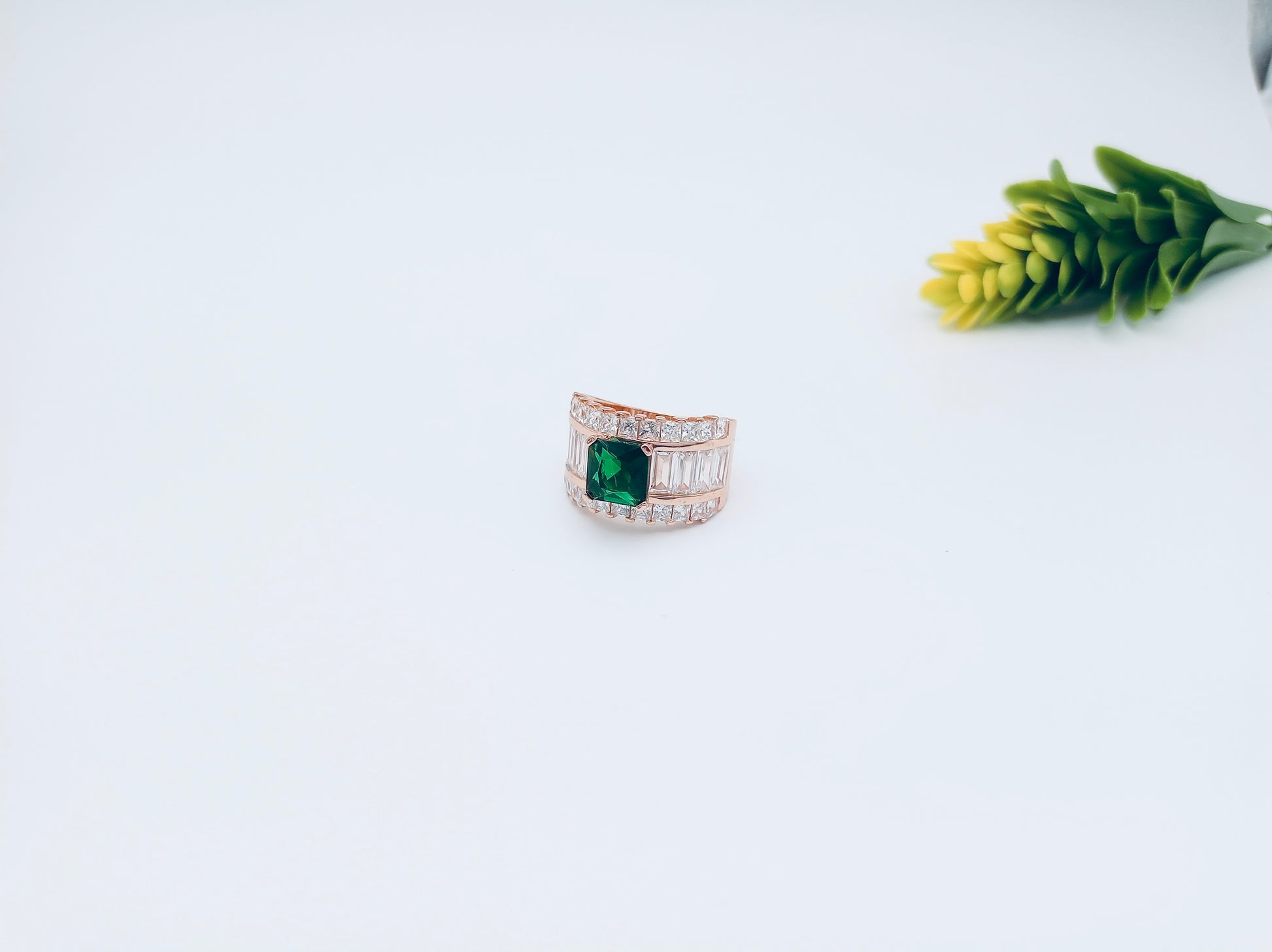 Experience luxury with this captivating silver ring, featuring an invisible setting that seamlessly showcases baguette-cut and round simulated stones. A striking green center stone, fashioned to resemble a premium emerald, sits at the heart of the wide silver band. The invisible settings create a flawless surface—so refined that even premium cameras struggle to fully capture its breathtaking sparkle and elegance. The ring maintains its polished shine for up to one year, making it ideal for special occasions and everyday sophistication.