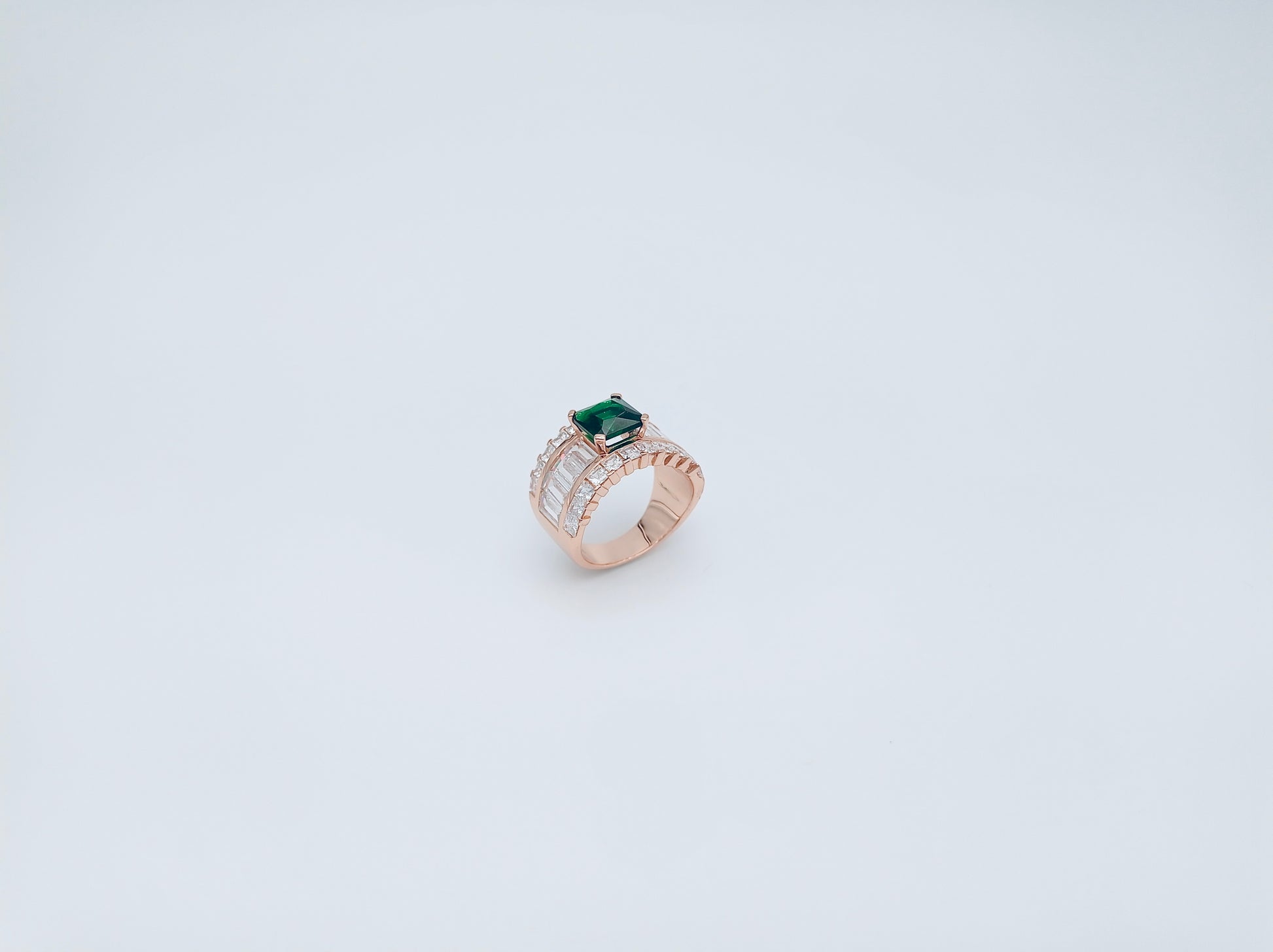 The green stone is a simulated gemstone, not a real emerald. All stones in this ring are simulated and not real diamonds. To maintain its exceptional beauty and polish, avoid exposure to soap, perfume, oil, or harsh chemicals.
