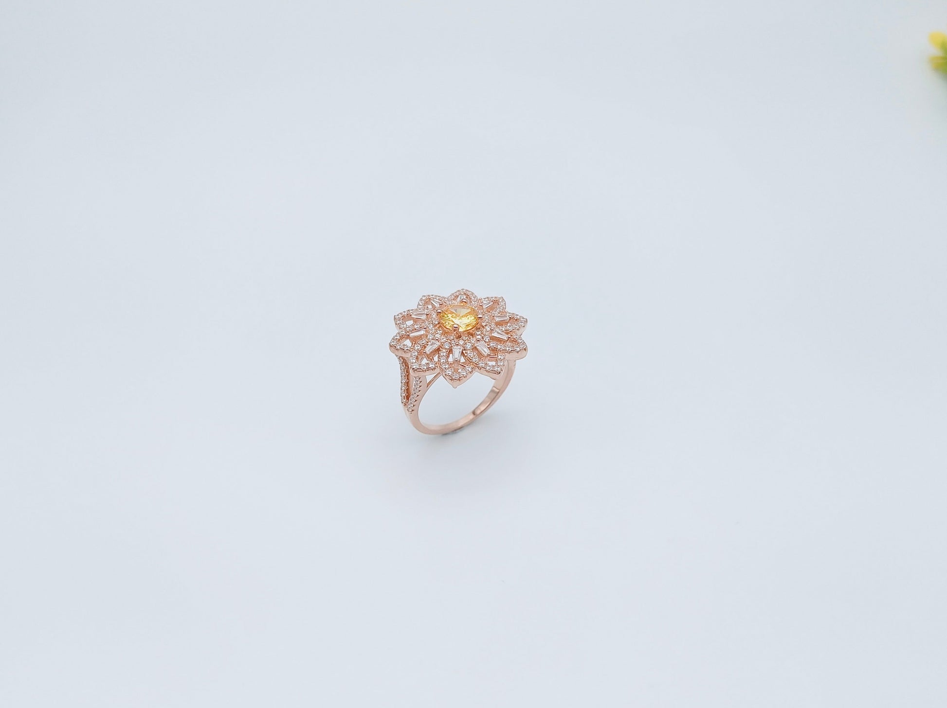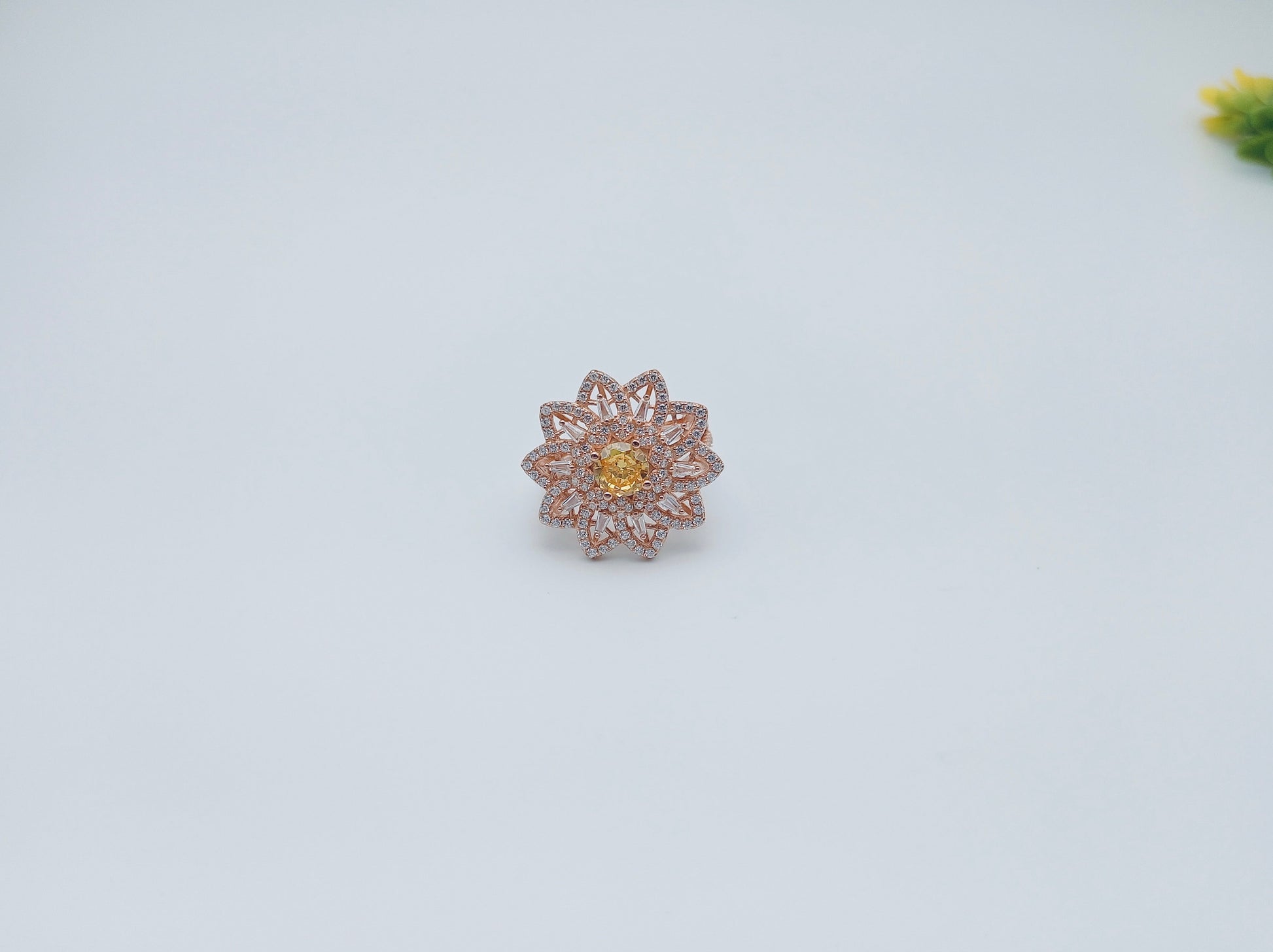 This exquisite rose gold ring features a striking lotus flower-inspired design, with delicately layered petals set with shimmering crystals. At the center sits a vibrant yellow simulated gemstone, radiating warmth and elegance. The openwork and intricate details make this ring an eye-catching statement piece, perfect for adding glamour to your special occasions.