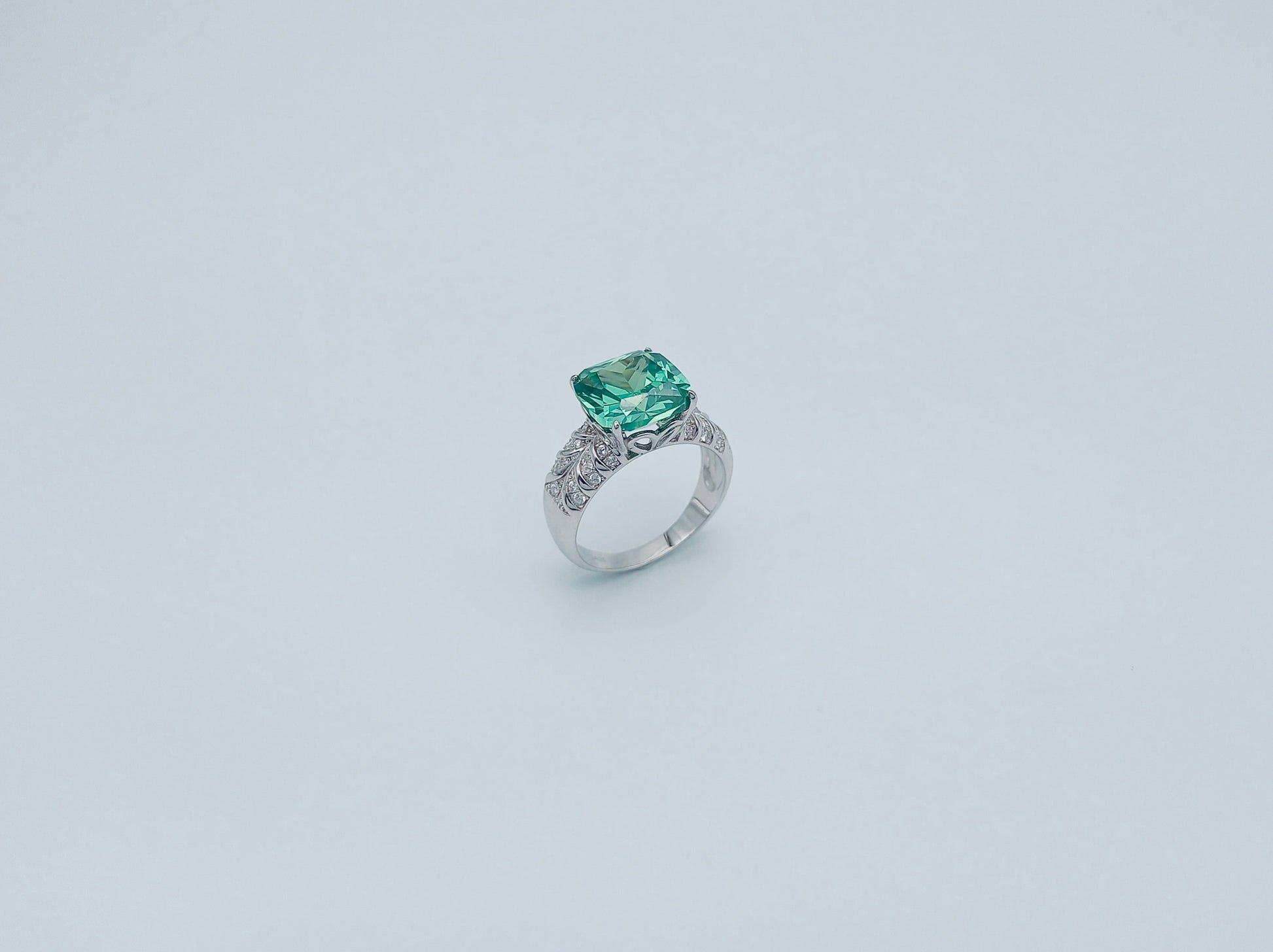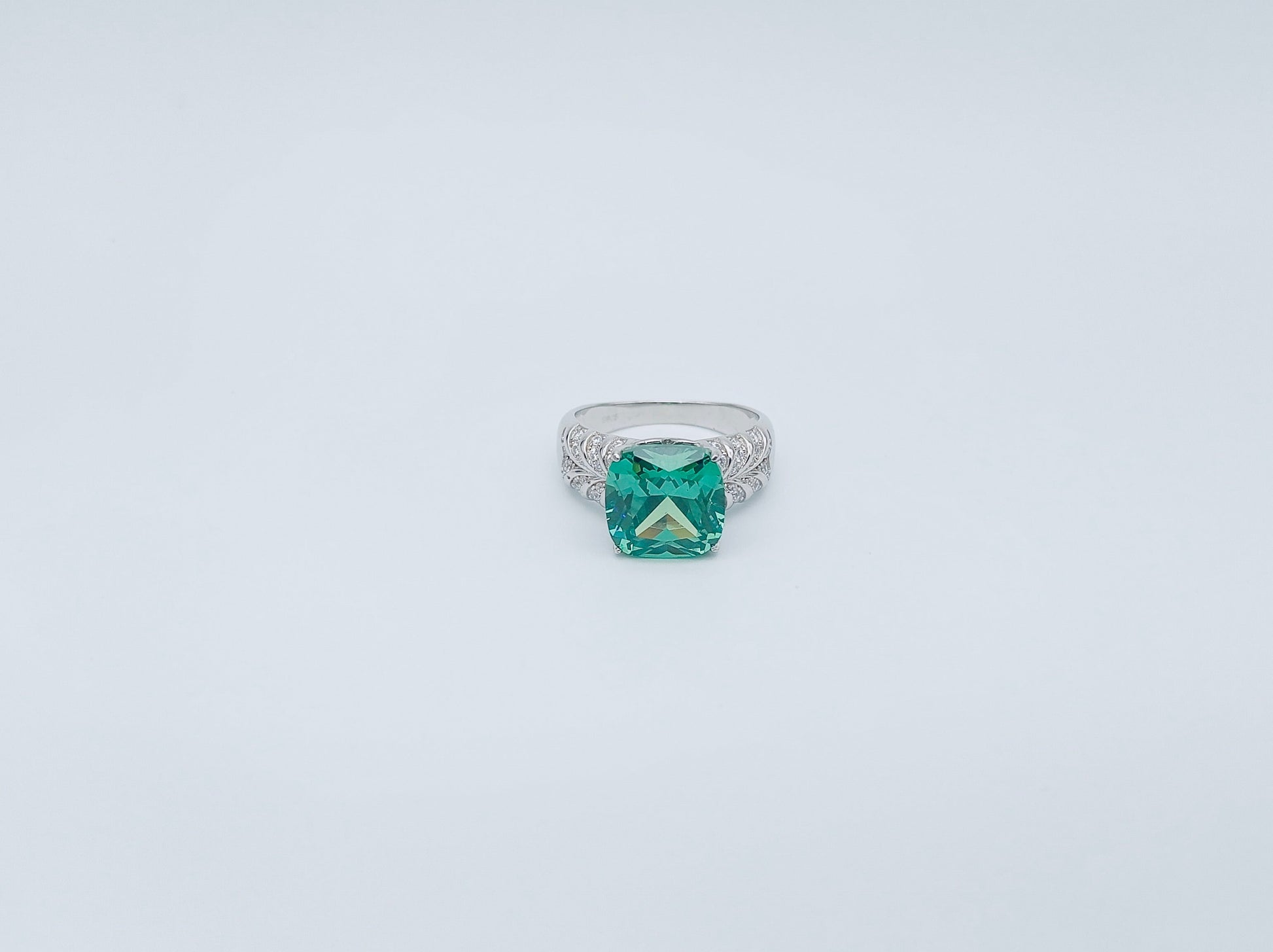 This eye-catching silver ring features a large, cushion-cut green stone with the vivid look of emerald. The finely engraved band adds intricate detail, enhancing the ring’s luxurious feel and classic charm. The centerpiece is a simulated emerald, offering gorgeous color and sparkle without the cost of a genuine gemstone.