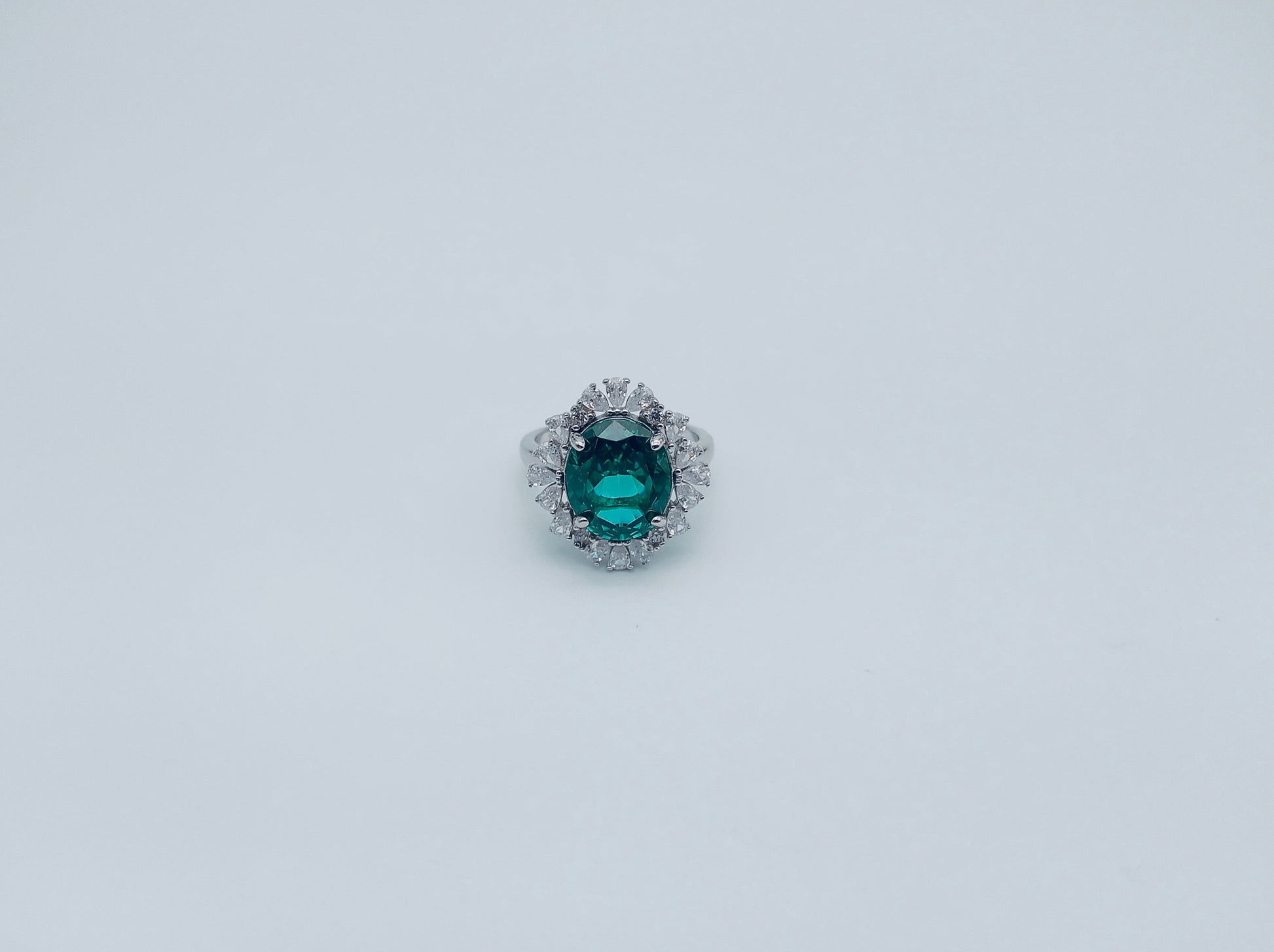 This elegant silver ring showcases a vivid green oval center stone, set in a classic halo design. The centerpiece is surrounded by brilliant clear stones, enhancing its sparkle and giving it a timeless, luxurious look. The ring band is crafted in sleek silver, making it a sophisticated choice for special occasions or everyday glamour. The green stone is a simulated gemstone, offering the beauty of an emerald look.